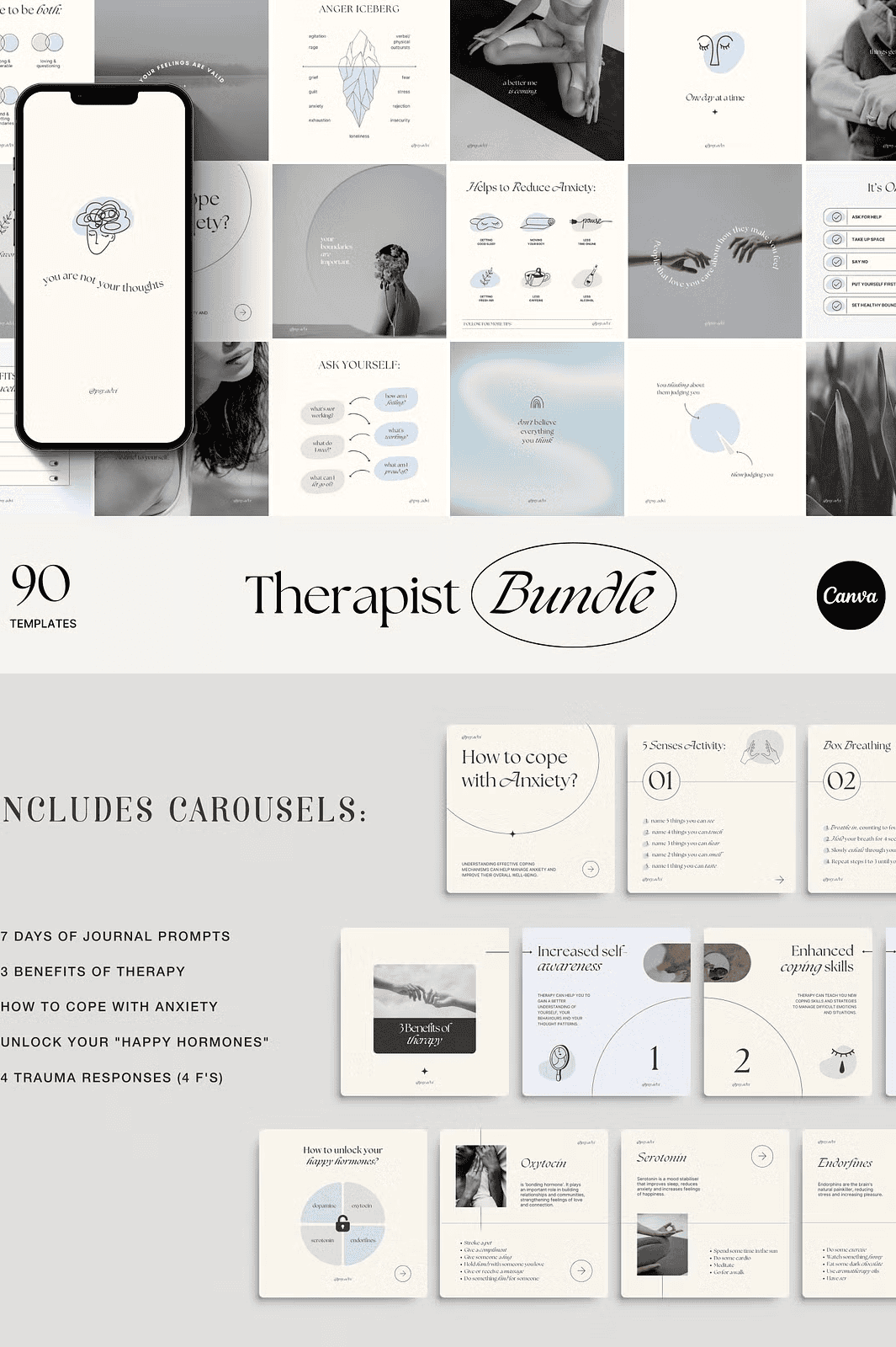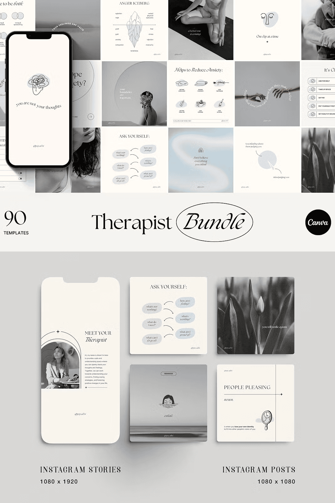- 90 ready-to-edit Instagram Stories (9:16 aspect ratio) — Ideal for daily reels, Q&As, polls, and rapid-fire mental health insights.
