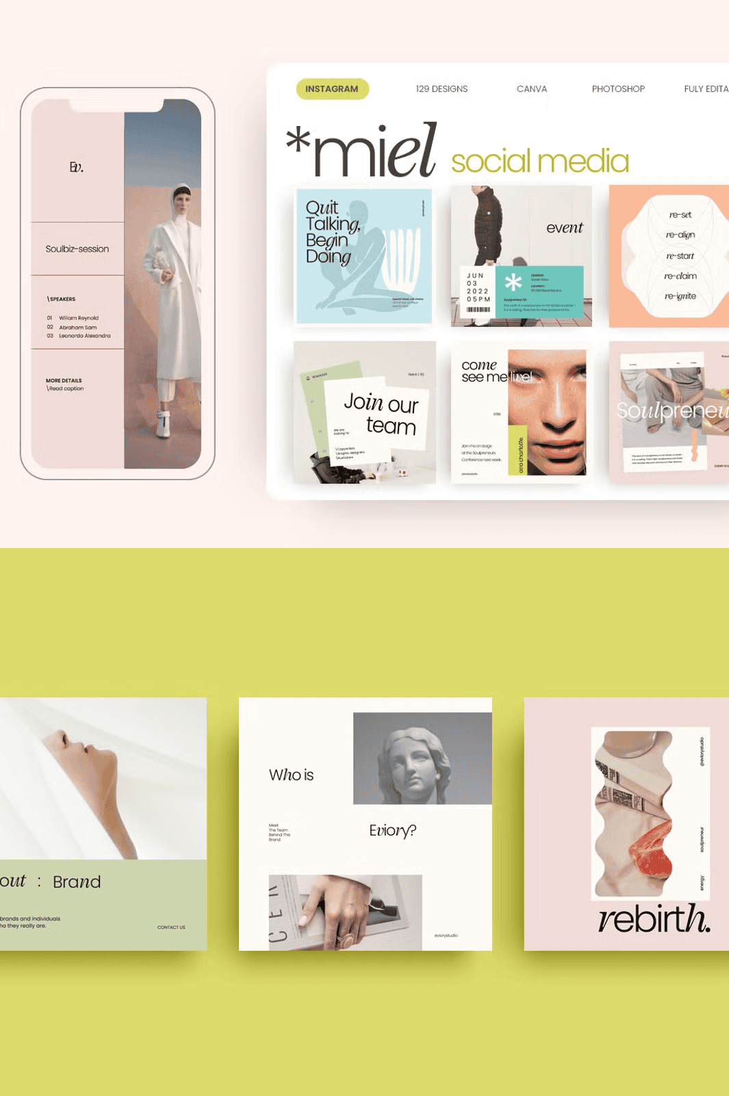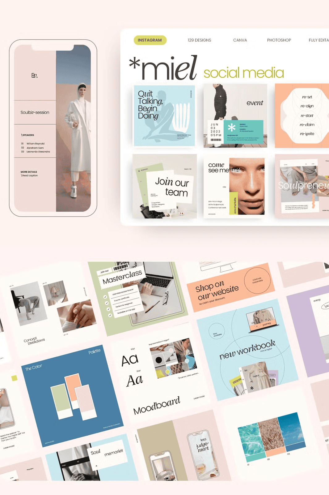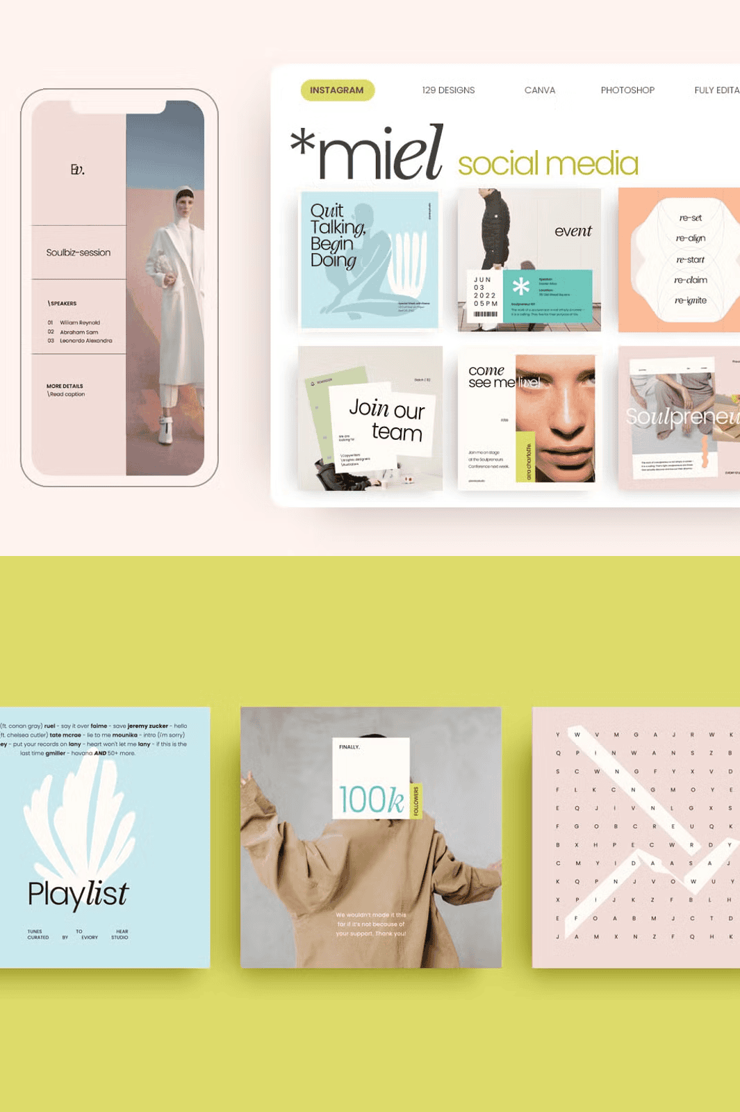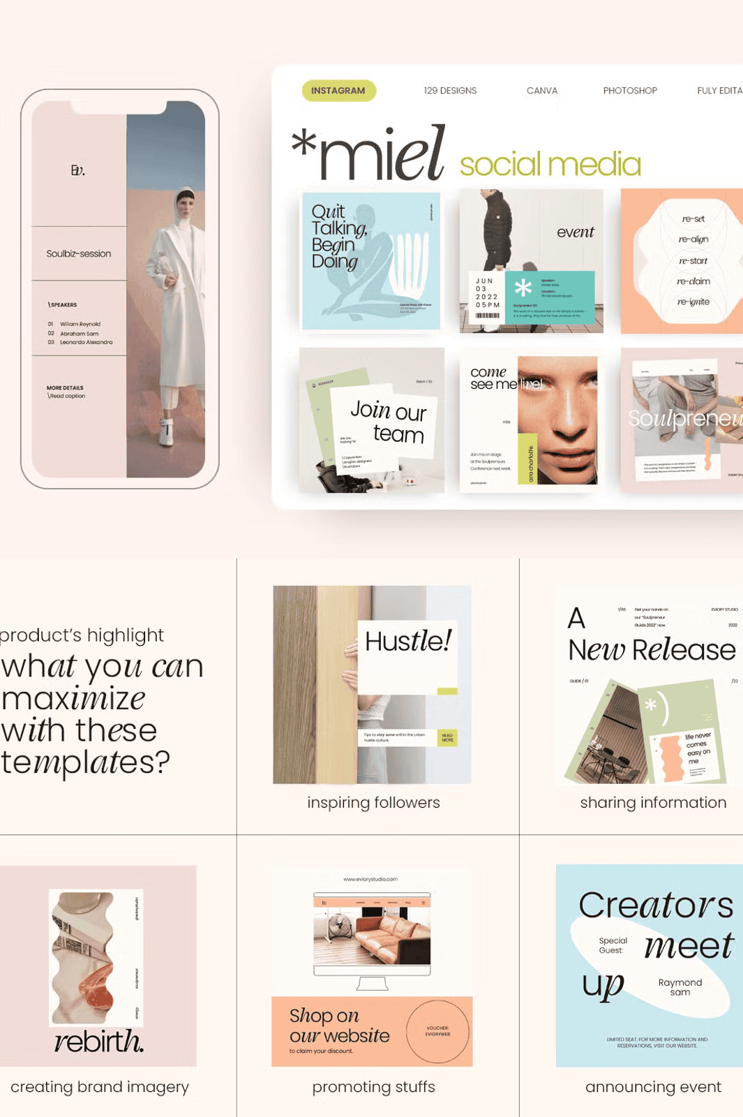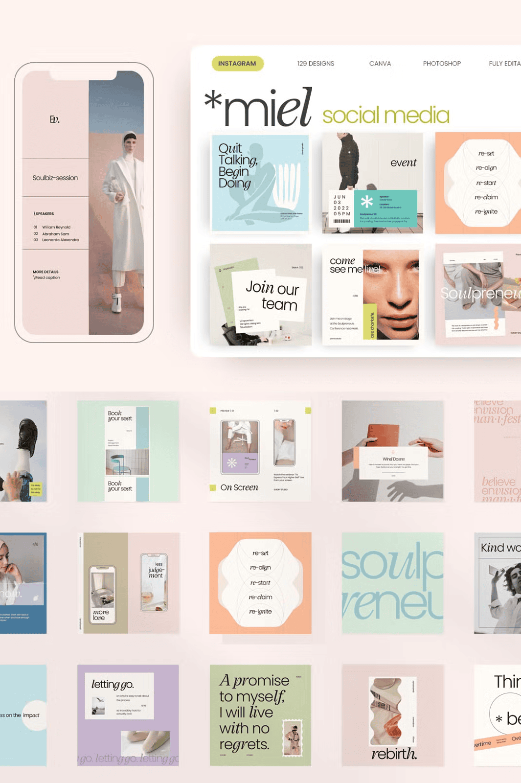 – **129 Editable Templates** – A rich variety of styles including minimalist layouts, bold typography, lifestyle framing, quote visuals, and brand showcase designs.
