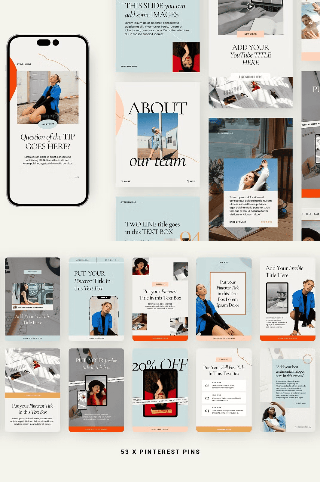 - 53 Pinterest Pin Designs (1000 x 1500 px) – Engineered for Pinterest’s algorithm. Use these as static Pins, video Pins, or carousels to drive long-term organic traffic and visibility.