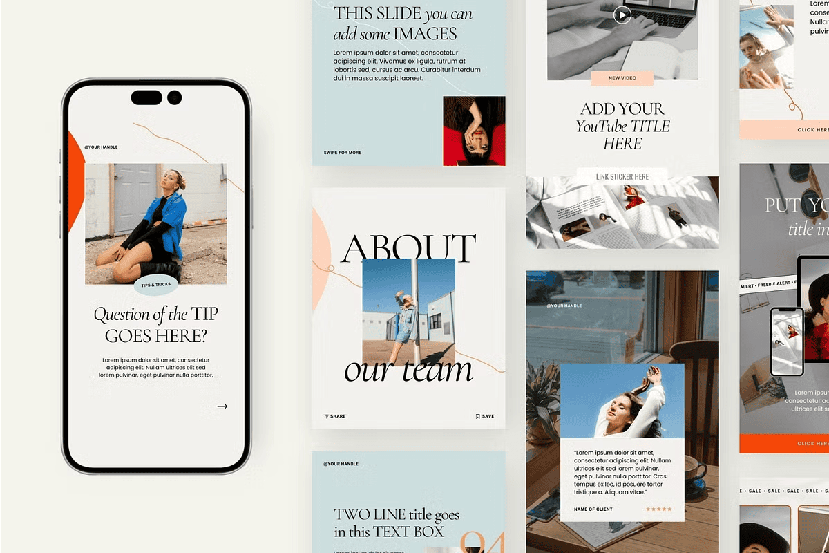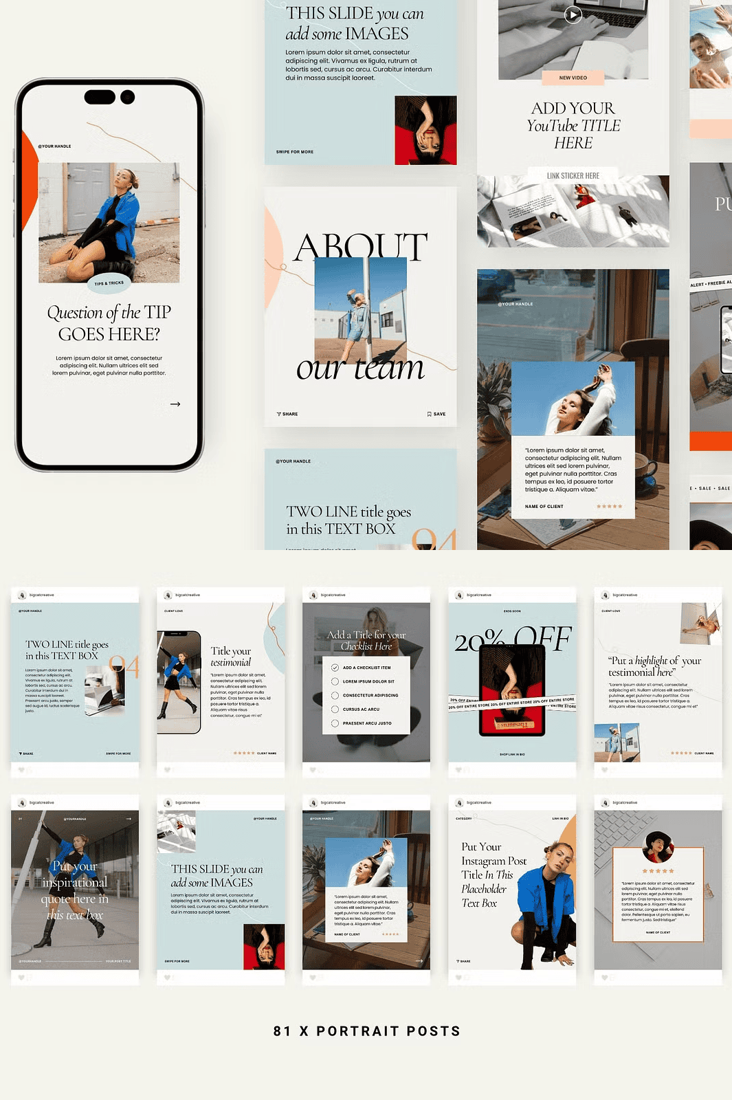 - 81 Portrait Instagram Posts (1080 x 1350 px) – Perfect for feed content, carousels, and Facebook posts. These designs maximize engagement with clean layouts and strong visual hierarchy.