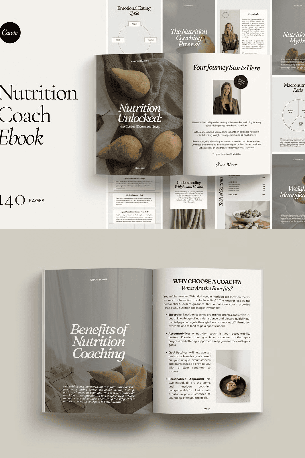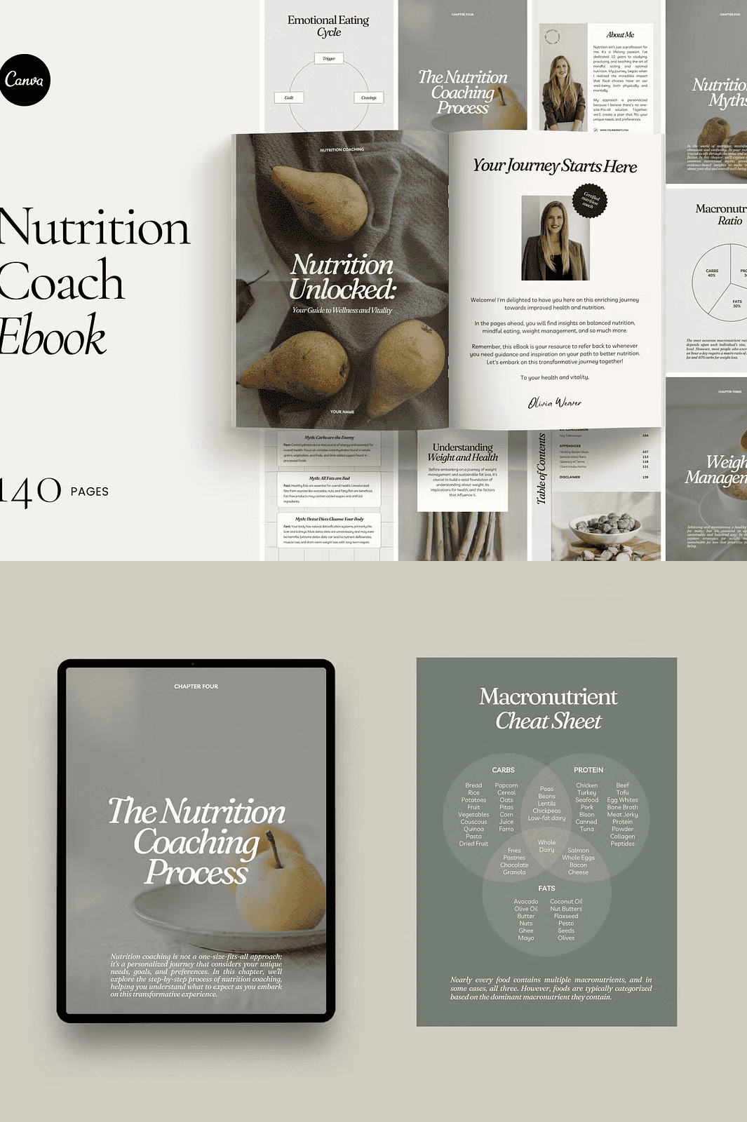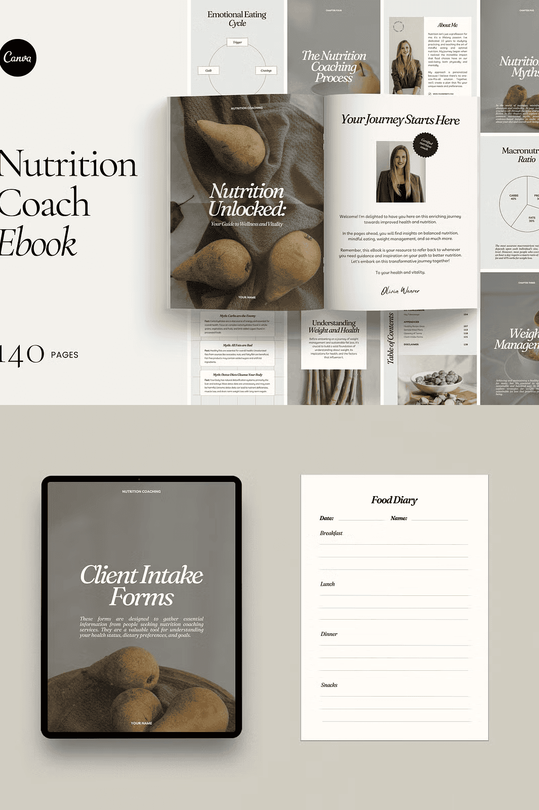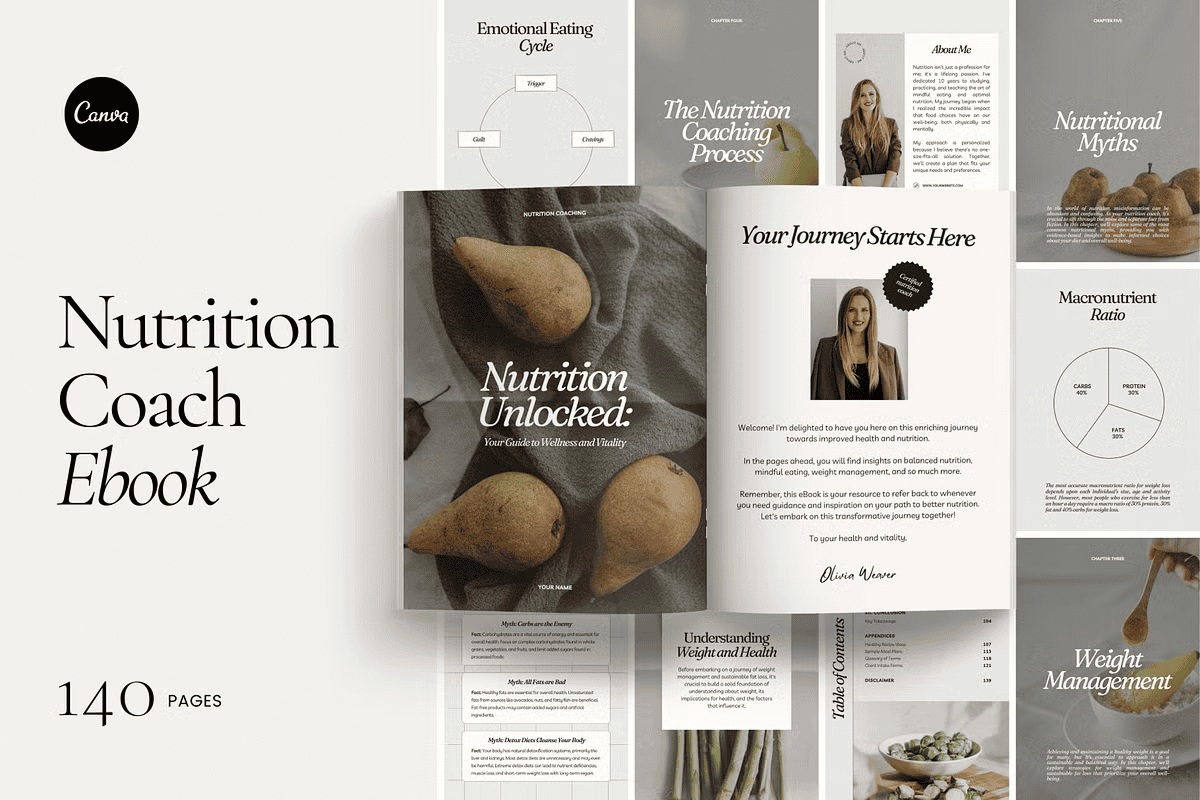 – **140-Page eBook Template in A4 Size**: A fully structured document ready for your content infusion, spanning foundational nutrition principles to advanced coaching strategies.