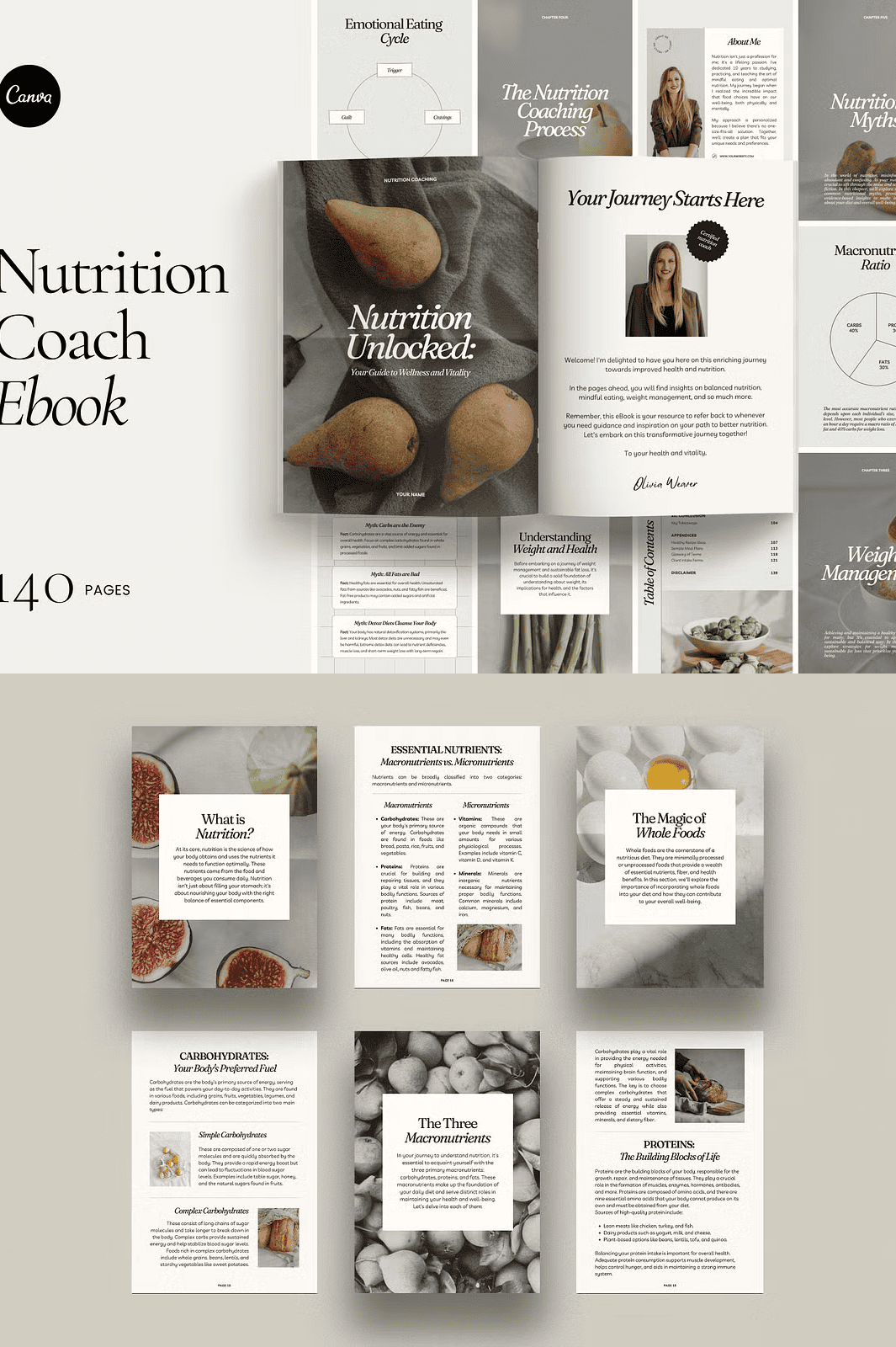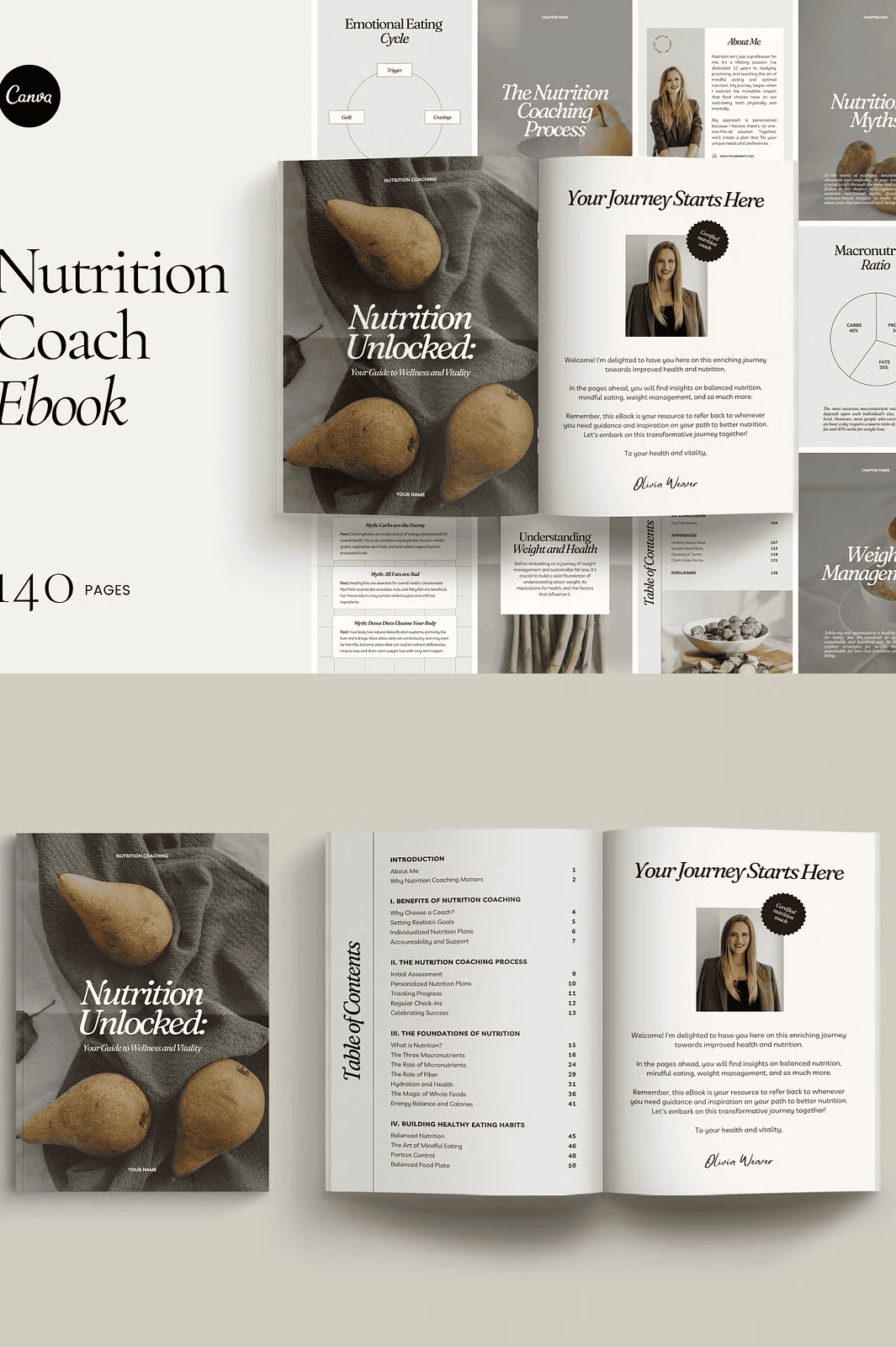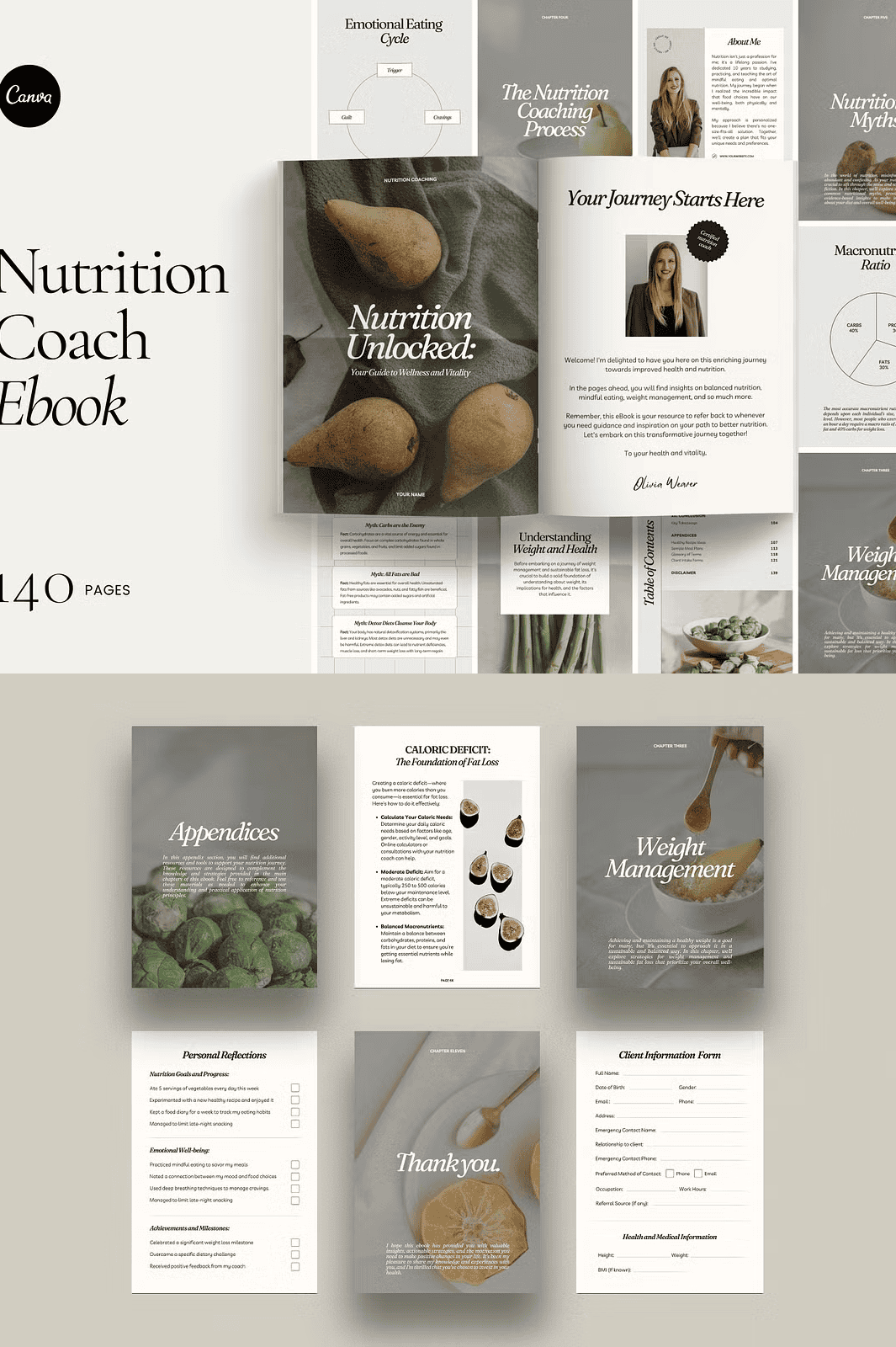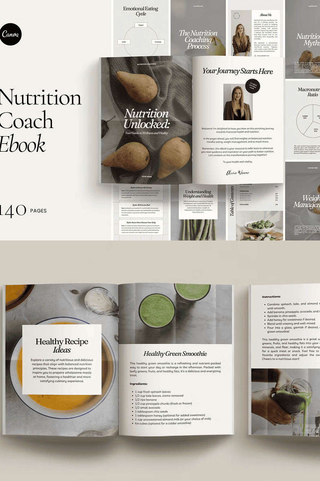 – **140-Page eBook Template in A4 Size**: A fully structured document ready for your content infusion, spanning foundational nutrition principles to advanced coaching strategies.