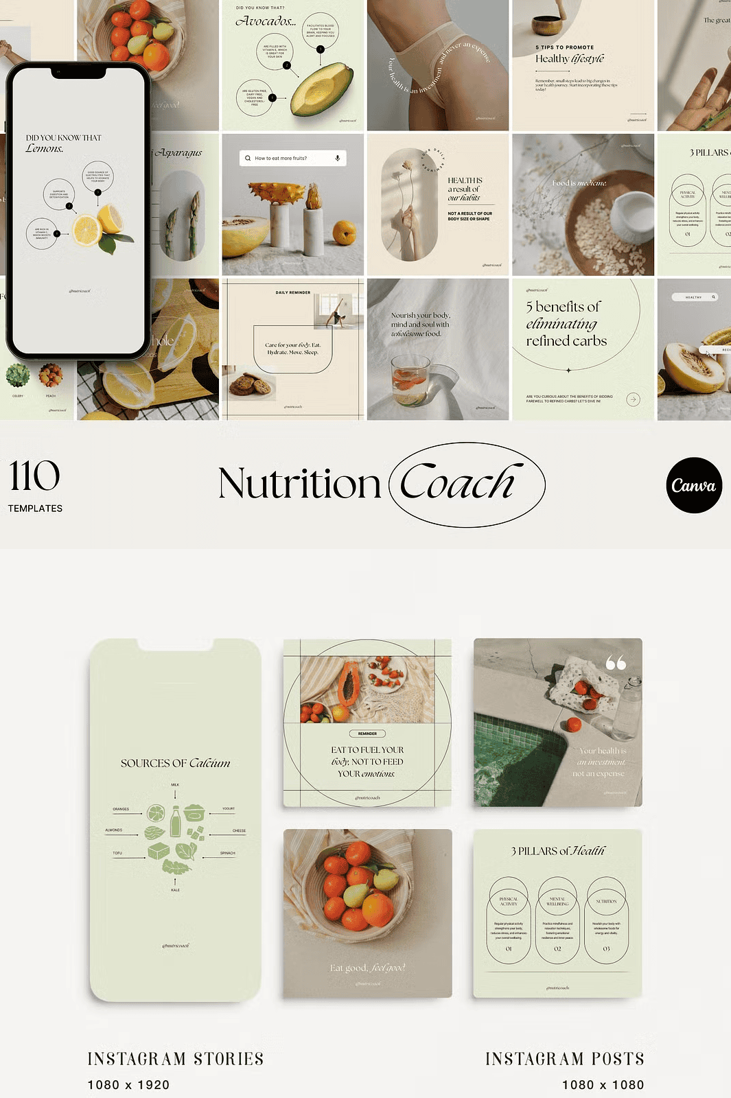 • 110 Square Instagram Posts (1080×1080): Ideal for clean, bold announcements, nutrition facts, healthy recipes, and lifestyle quotes.