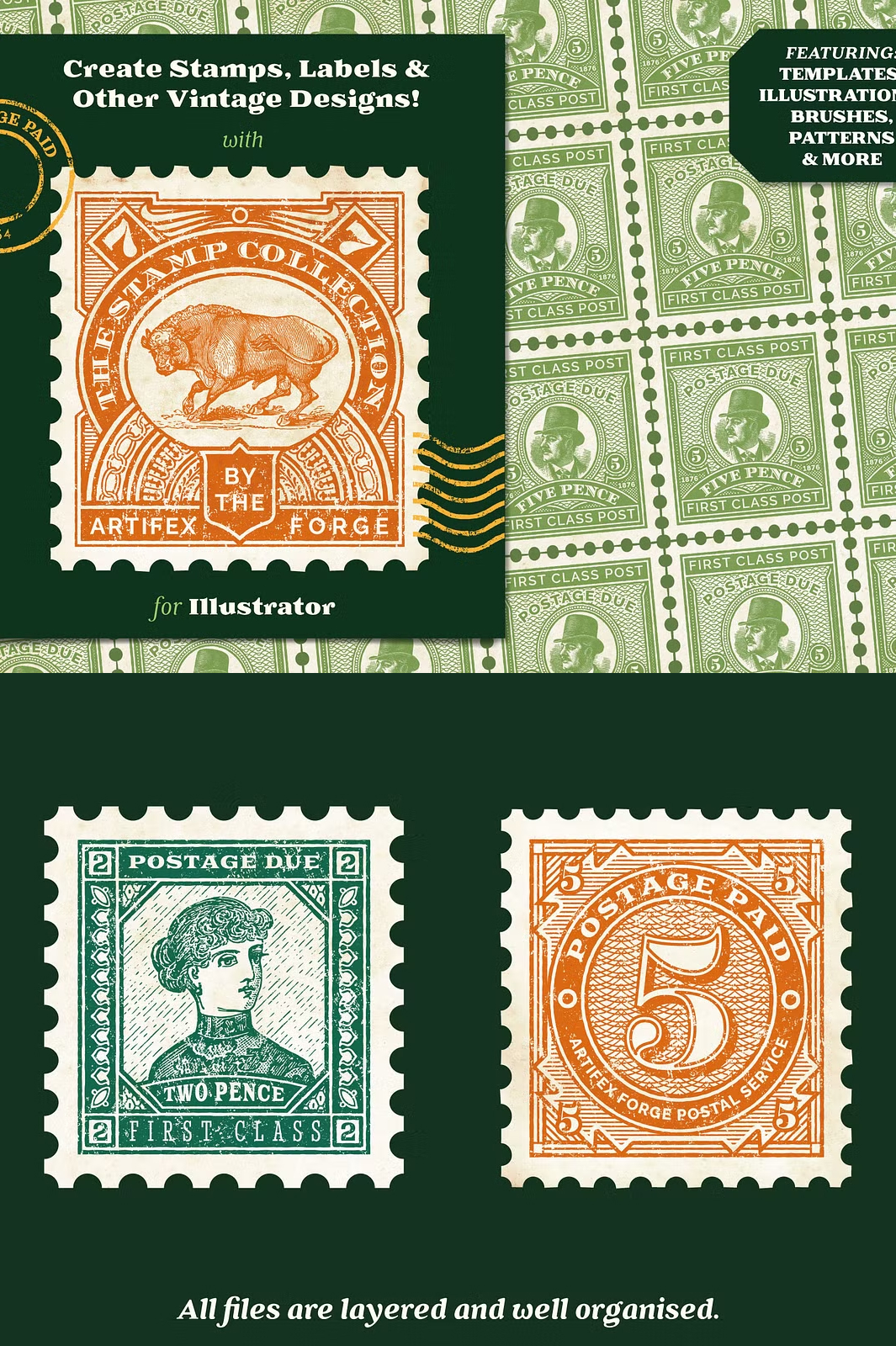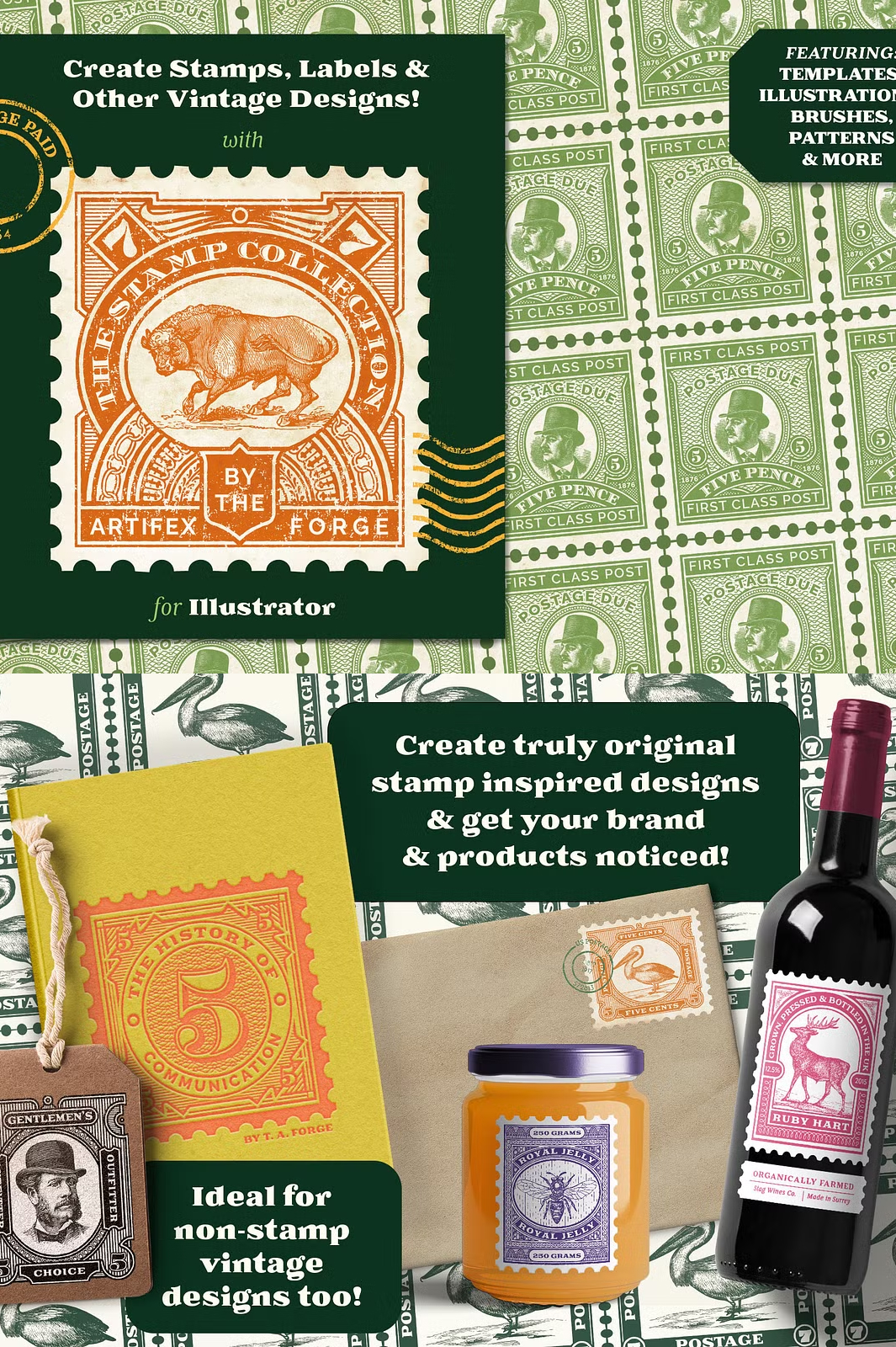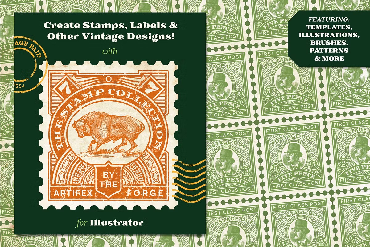 - 10 Vintage Postage Stamp Templates – Fully editable with live Illustrator brushes and textures.