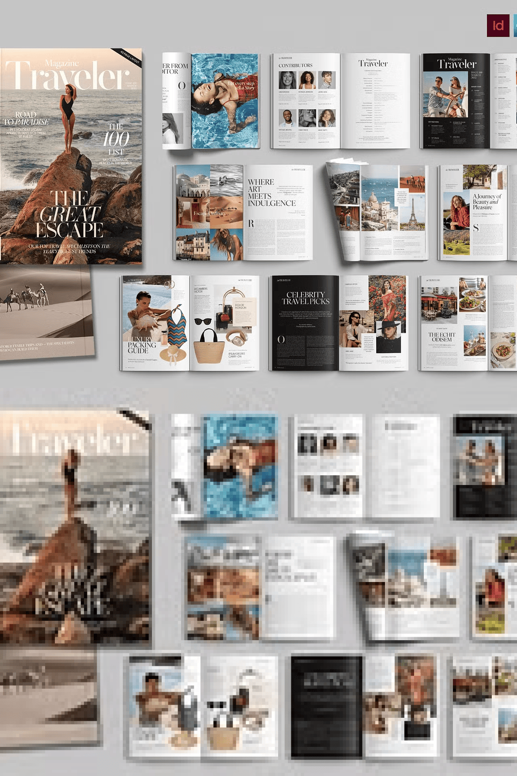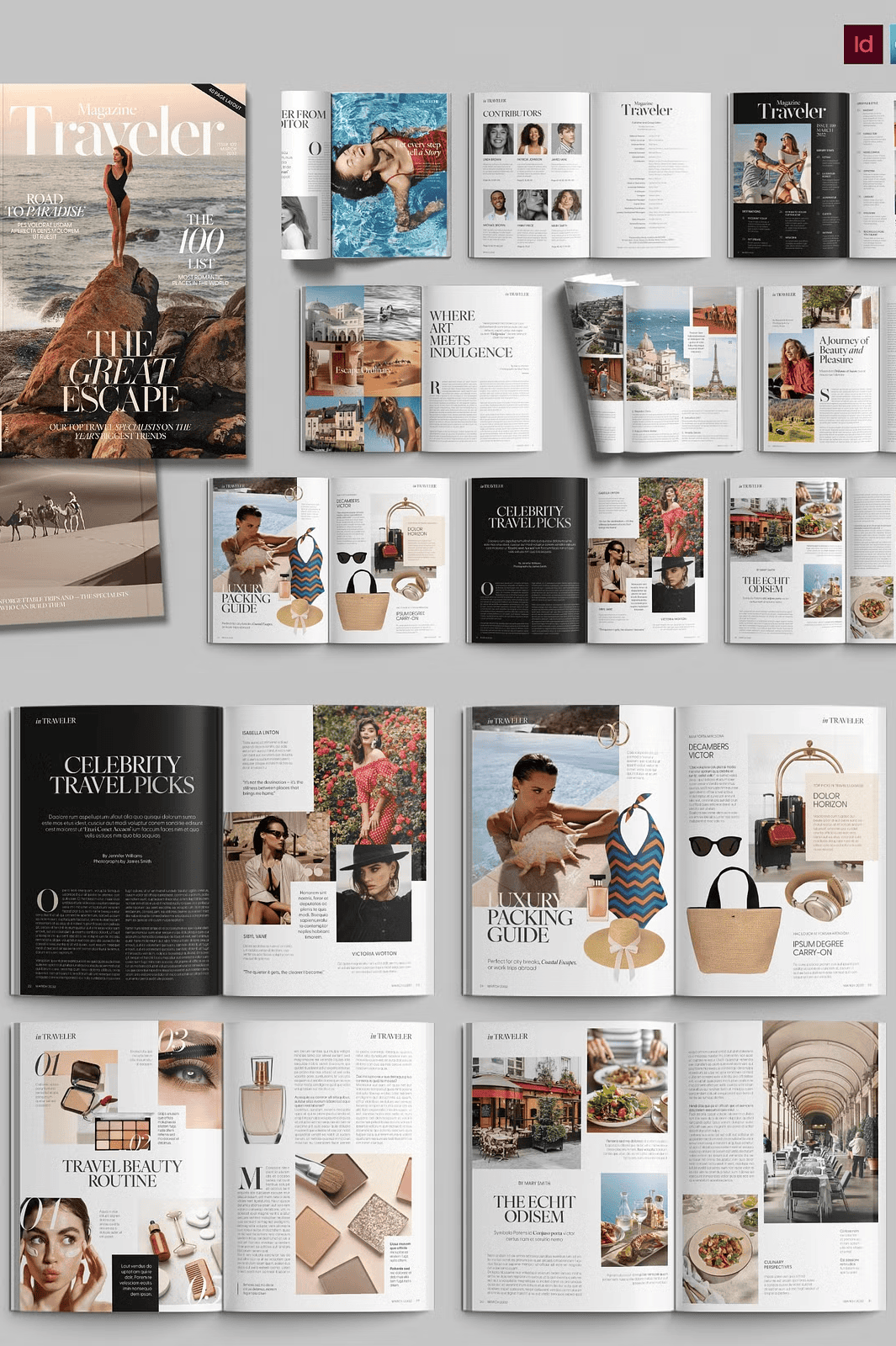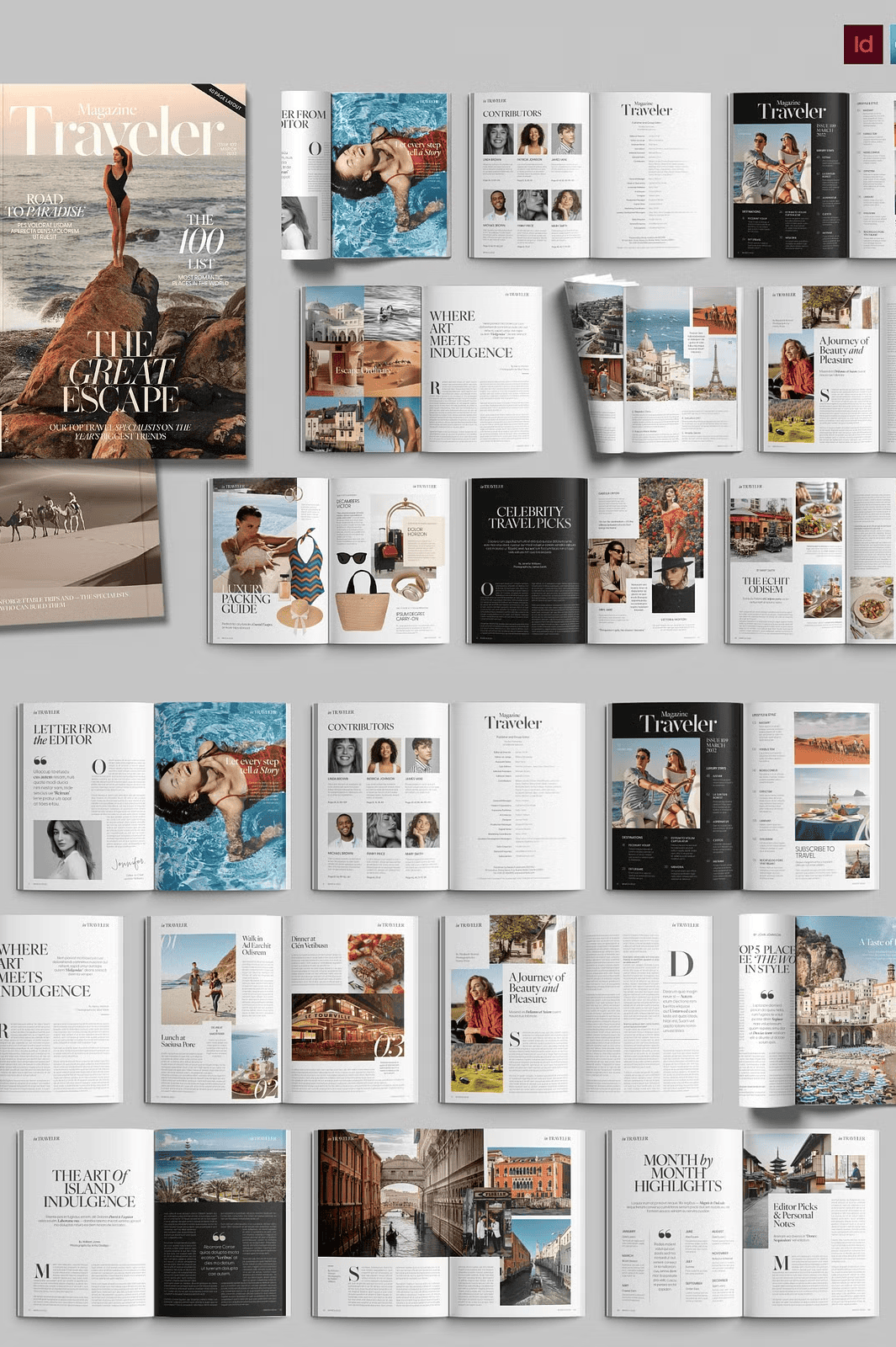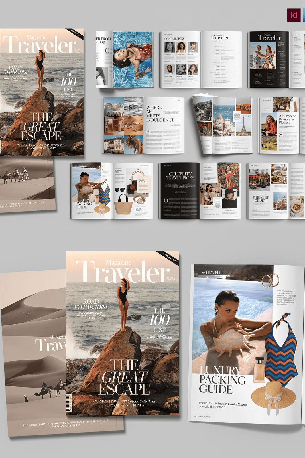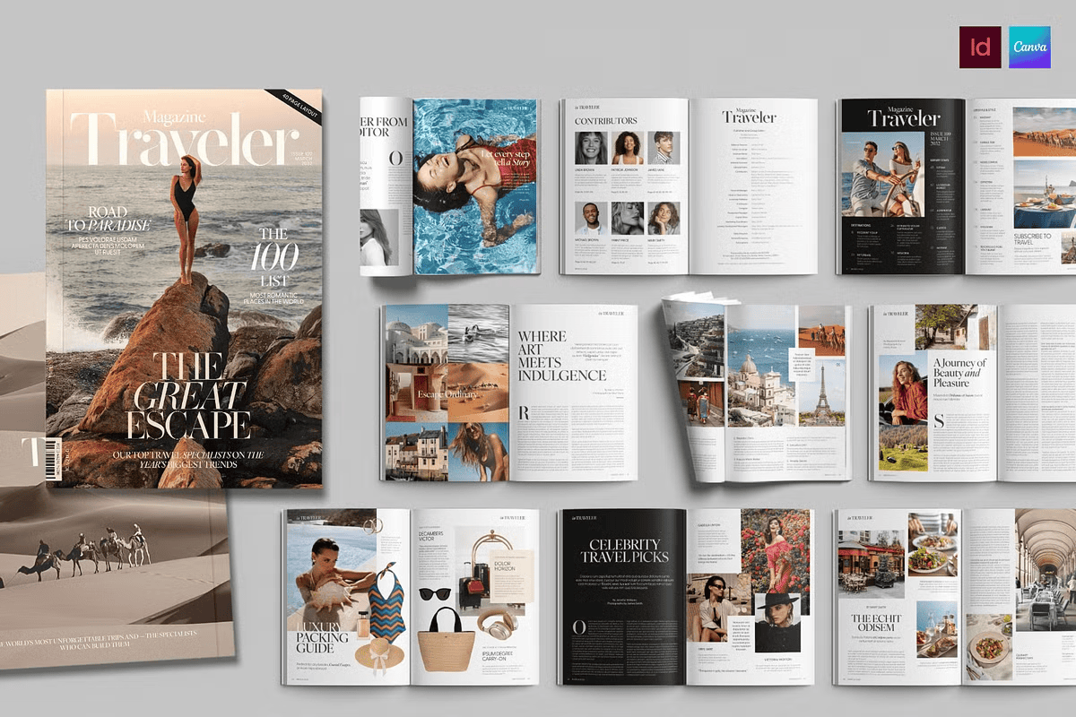 – **40 Premium Page Layouts** – A diverse range of sophisticated designs, from full-bleed photo spreads and elegant feature articles to clean product showcases and compelling call-to-action pages.