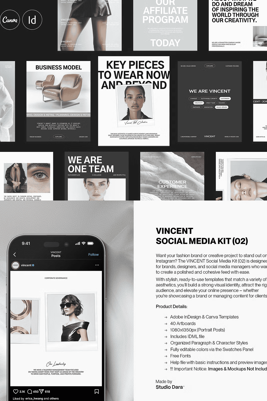 Stop settling for generic content templates that blend into the noise. The **VINCENT Social Media Kit (02)** by Studio Dara is engineered to position your brand at the forefront of visual storytelling. Designed for Canva and Adobe InDesign, this high-performance toolkit delivers 40 versatile portrait-style templates (1080x1350px) crafted to maximize engagement, enhance brand credibility, and accelerate your content creation workflow.