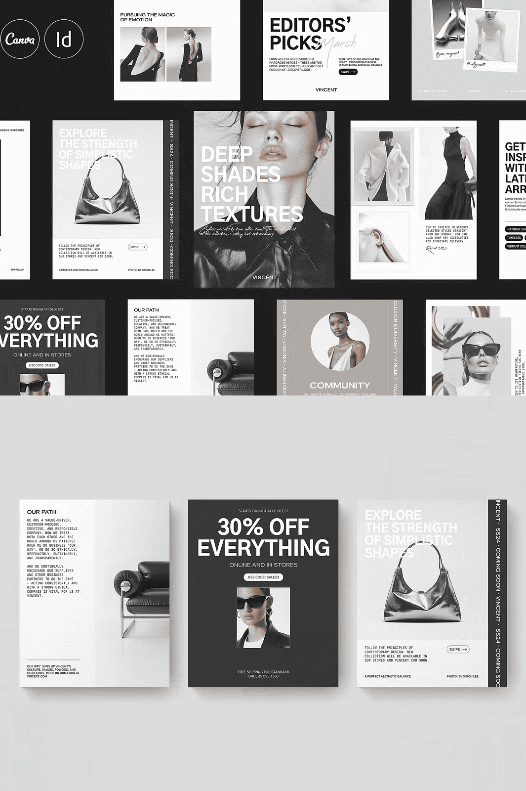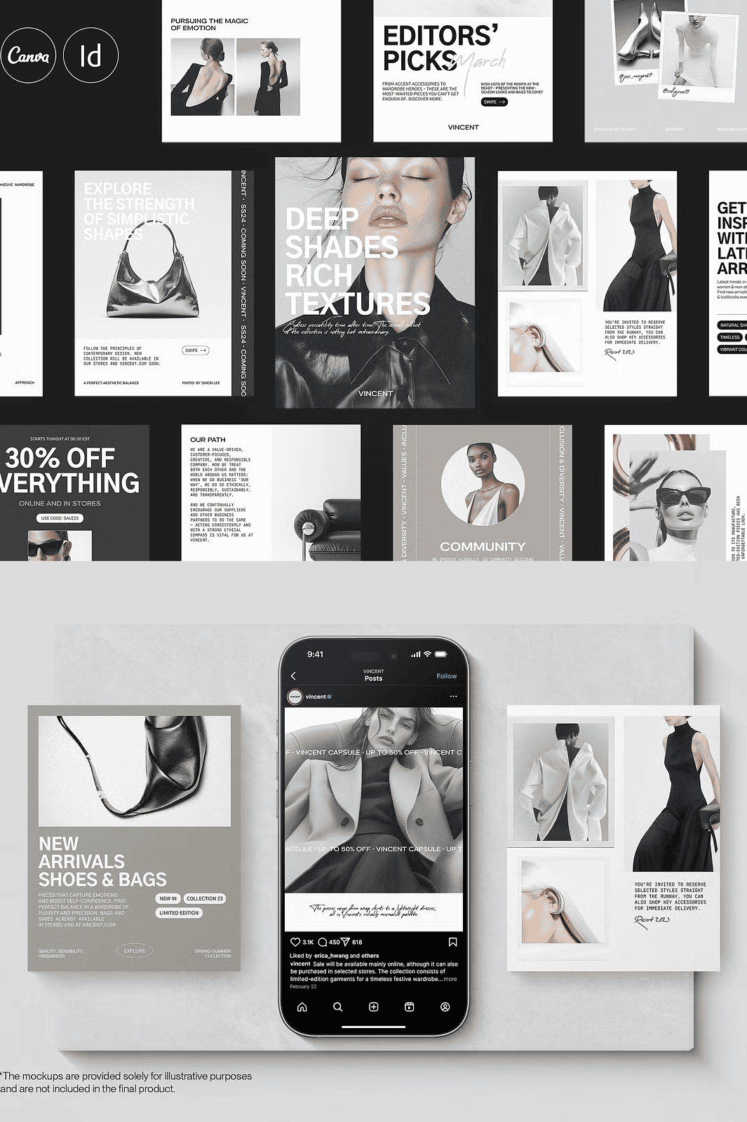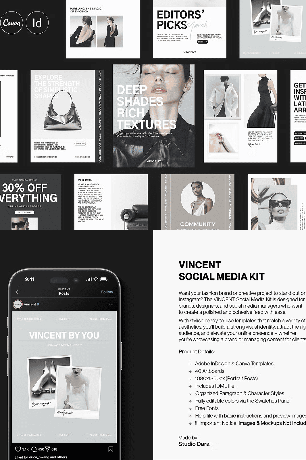 Step into a world of refined digital presence with the VINCENT Social Media Kit — a powerful, professional template suite meticulously crafted for fashion brands, social media managers, design studios, and creative agencies. With 40 striking, portrait-format templates (1080×1350 px), this kit equips you to create consistent, high-impact content that captures attention and reflects your brand’s premium aesthetic. From product highlights to seasonal promotions, quote posts to exclusive announcements, every template is optimized for Instagram’s fast-paced visual landscape.