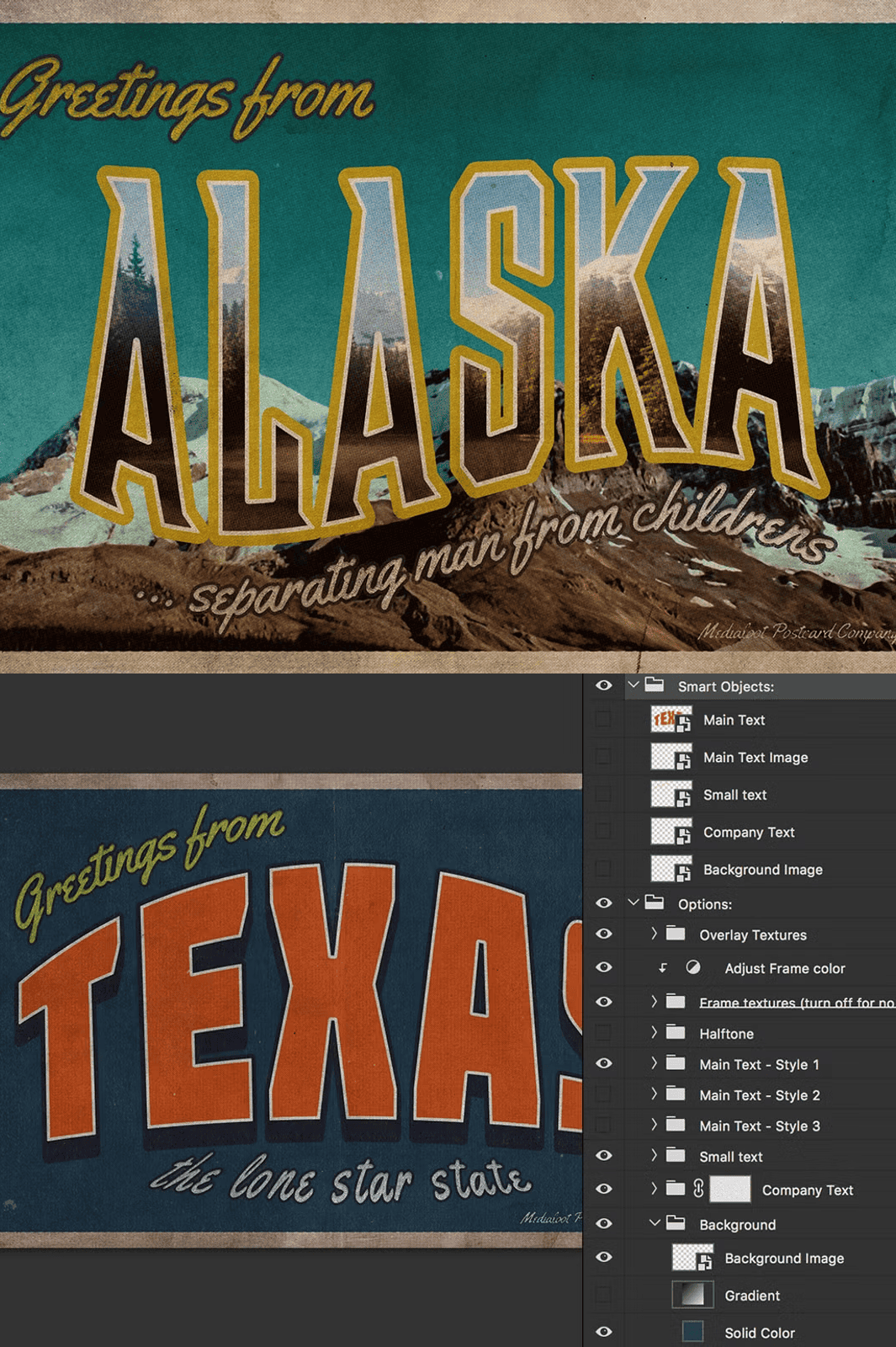 Every element is designed with **Smart Objects**, giving you full control over headlines, optional masked images, supporting text, and background layers. Adjust fonts, colors, layout, and textures with a single click — no complex masking or layer management required. The intuitive setup ensures even beginners can create polished, vintage-style postcards that feel handcrafted and authentic.