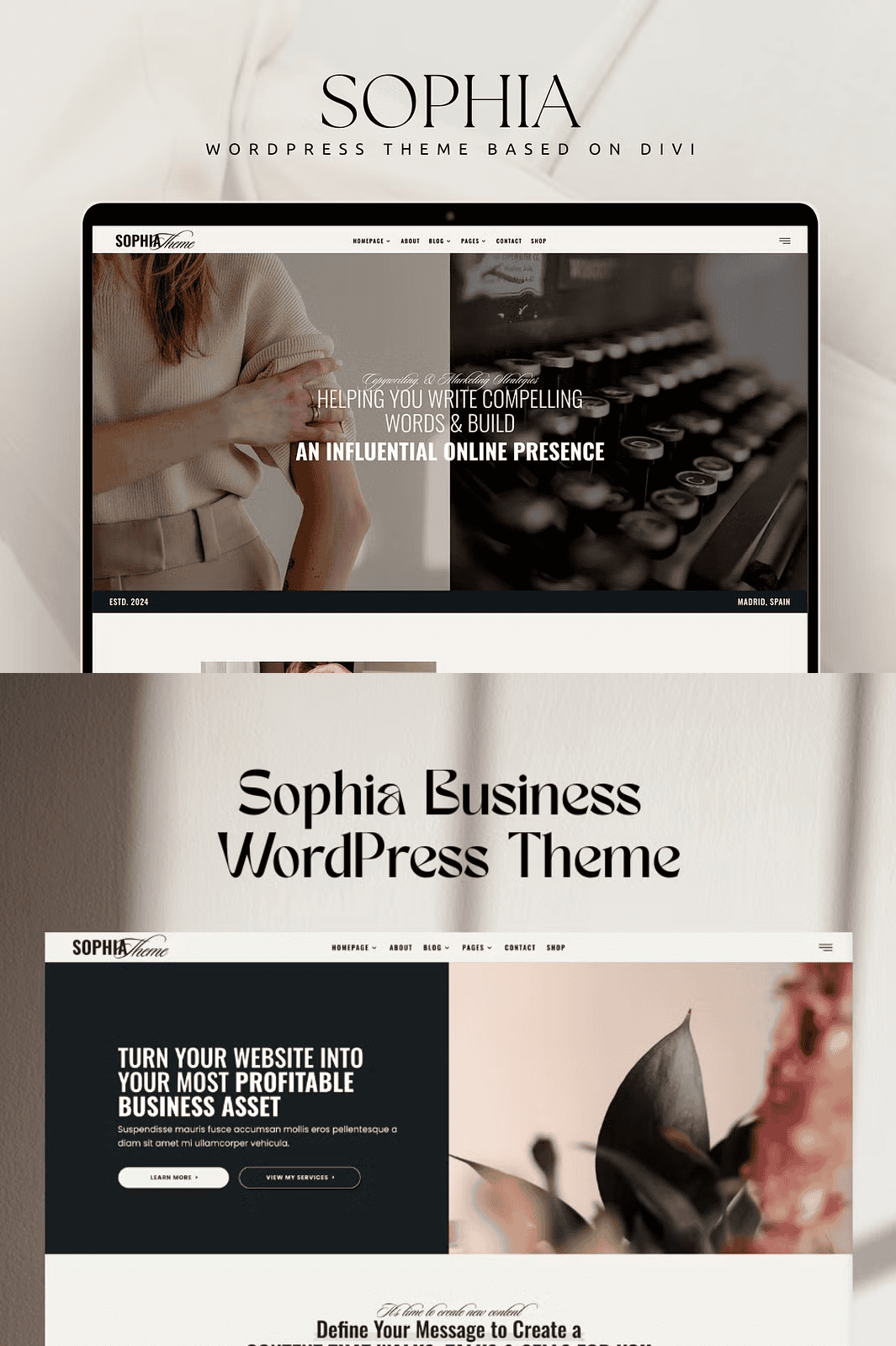 Sophia includes over 16 fully customizable, mobile-responsive page templates to accelerate your online presence. Choose from 3 unique homepage designs, each crafted to highlight different aspects of your brand and service offering. Use the sales-oriented homepage to generate leads, the portfolio page to showcase your work, or the investment page to convert readers into paying clients.