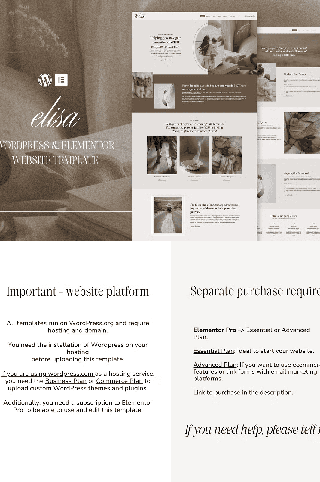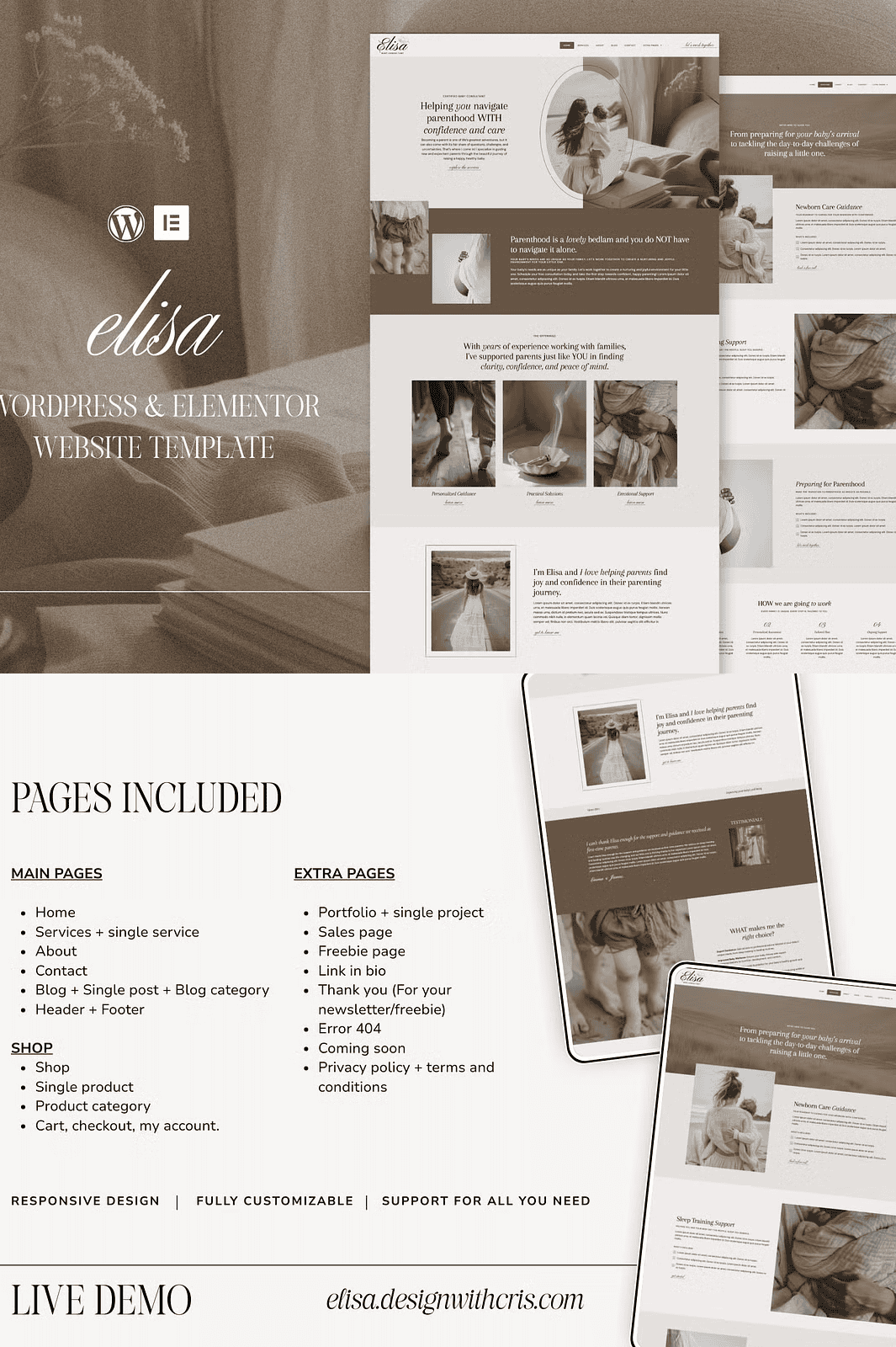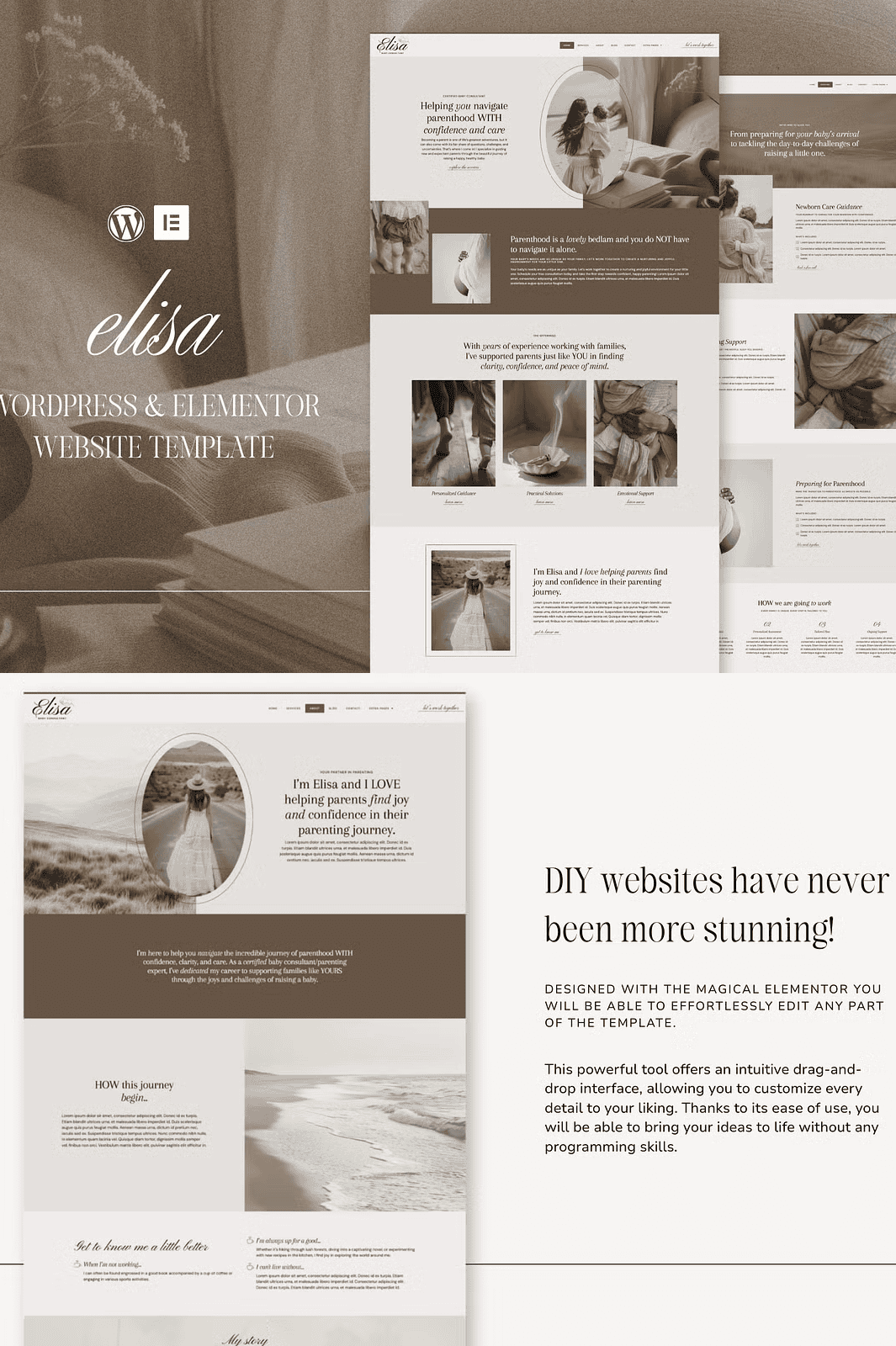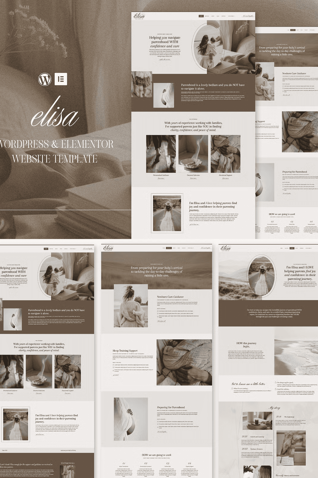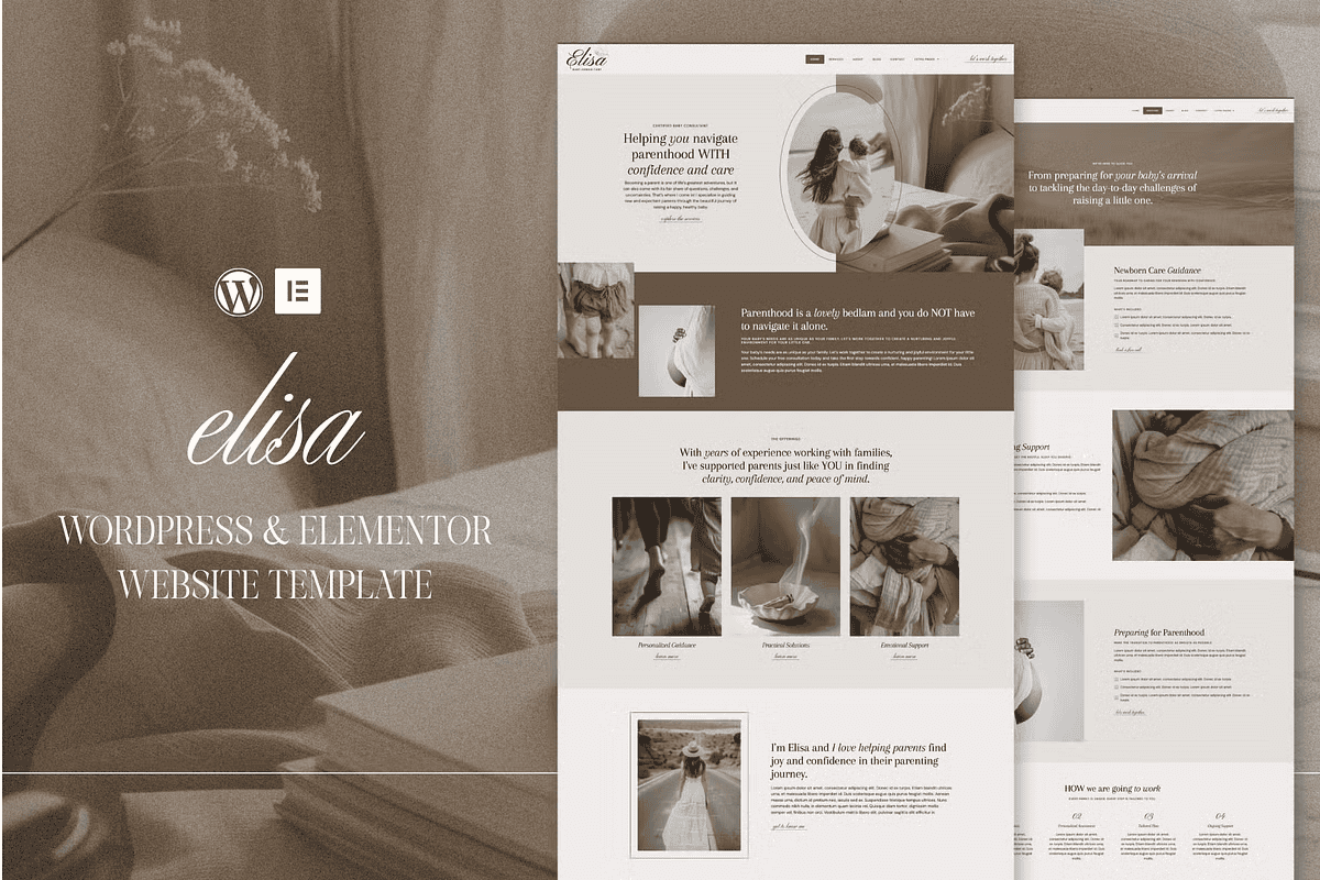 **Keywords**: Elisa WordPress template, Elementor Pro theme for coaches, Elegant website builder for therapists, Creative service provider website, WordPress Elementor template for baby consultants, DIY coaching website, Customizable WordPress theme, One-click import Elementor, WooCommerce WordPress theme, Email marketing site, Free installation WordPress theme