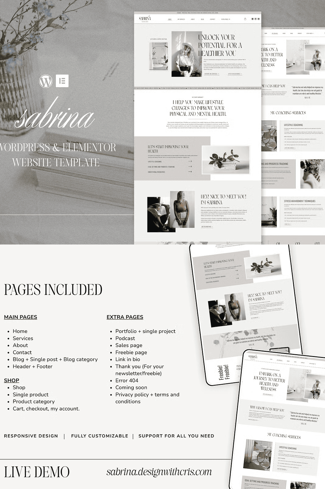 Unlock the power of stunning visuals and seamless functionality with the Sabrina WordPress Elementor Pro Template, a razor-sharp minimalist design crafted for bloggers, coaches, photographers, consultants, and creative entrepreneurs. Built for speed, clarity, and full customization, Sabrina transforms your vision into a high-performing website—fast, clean, and fully responsive across every device.