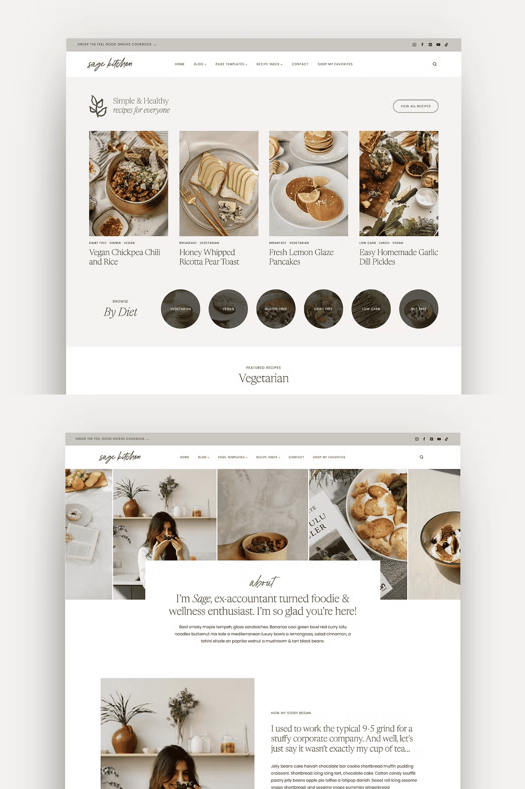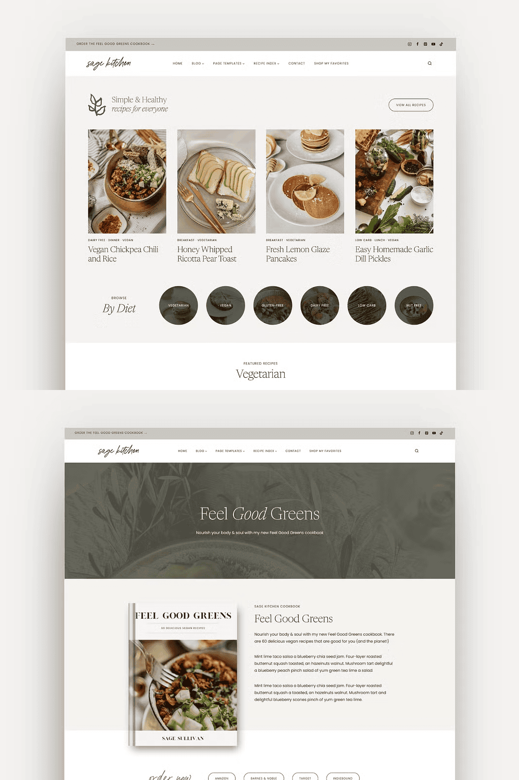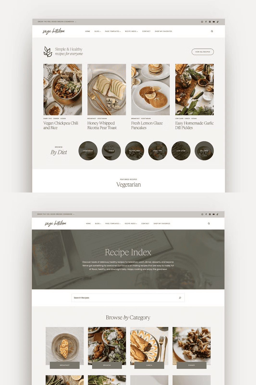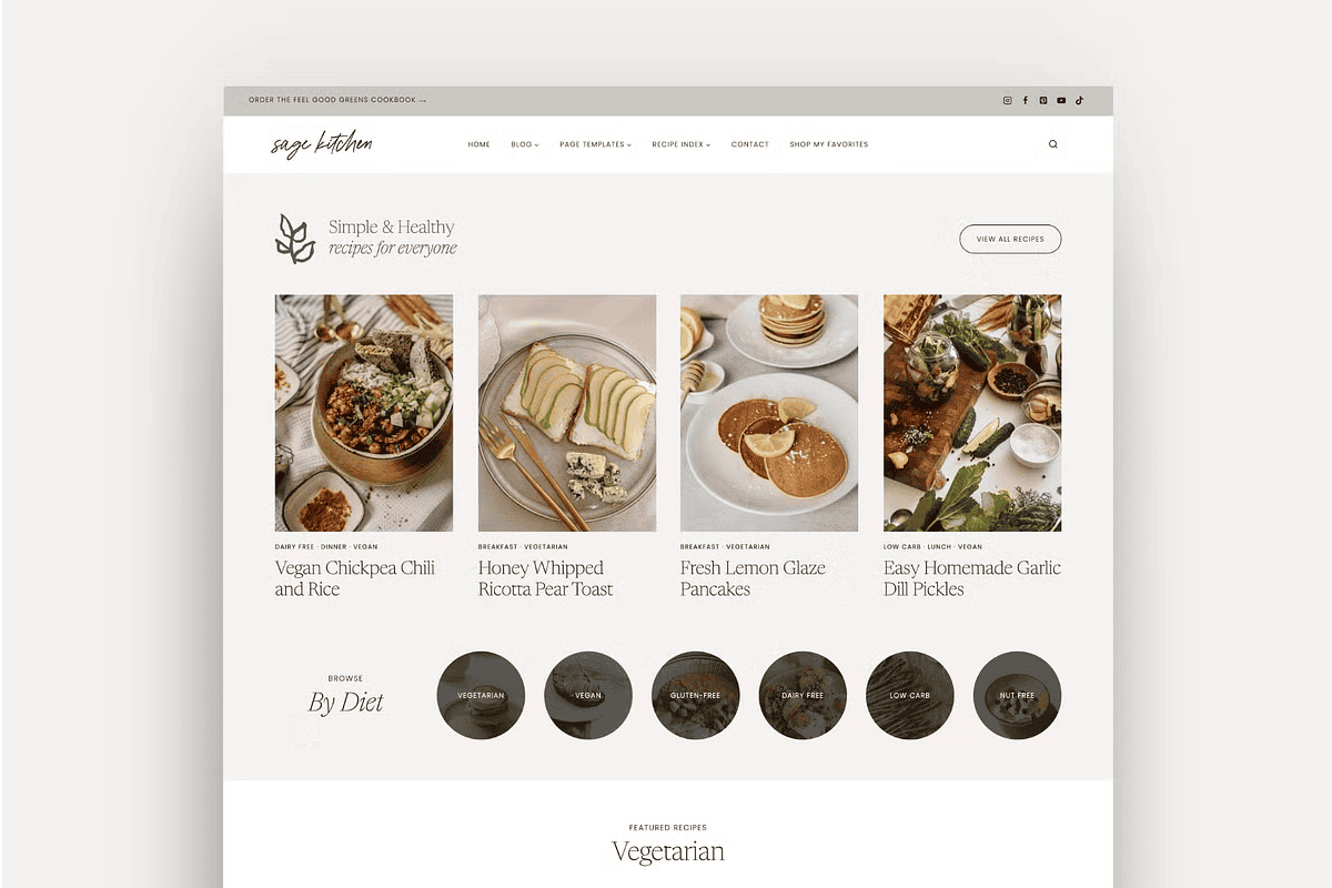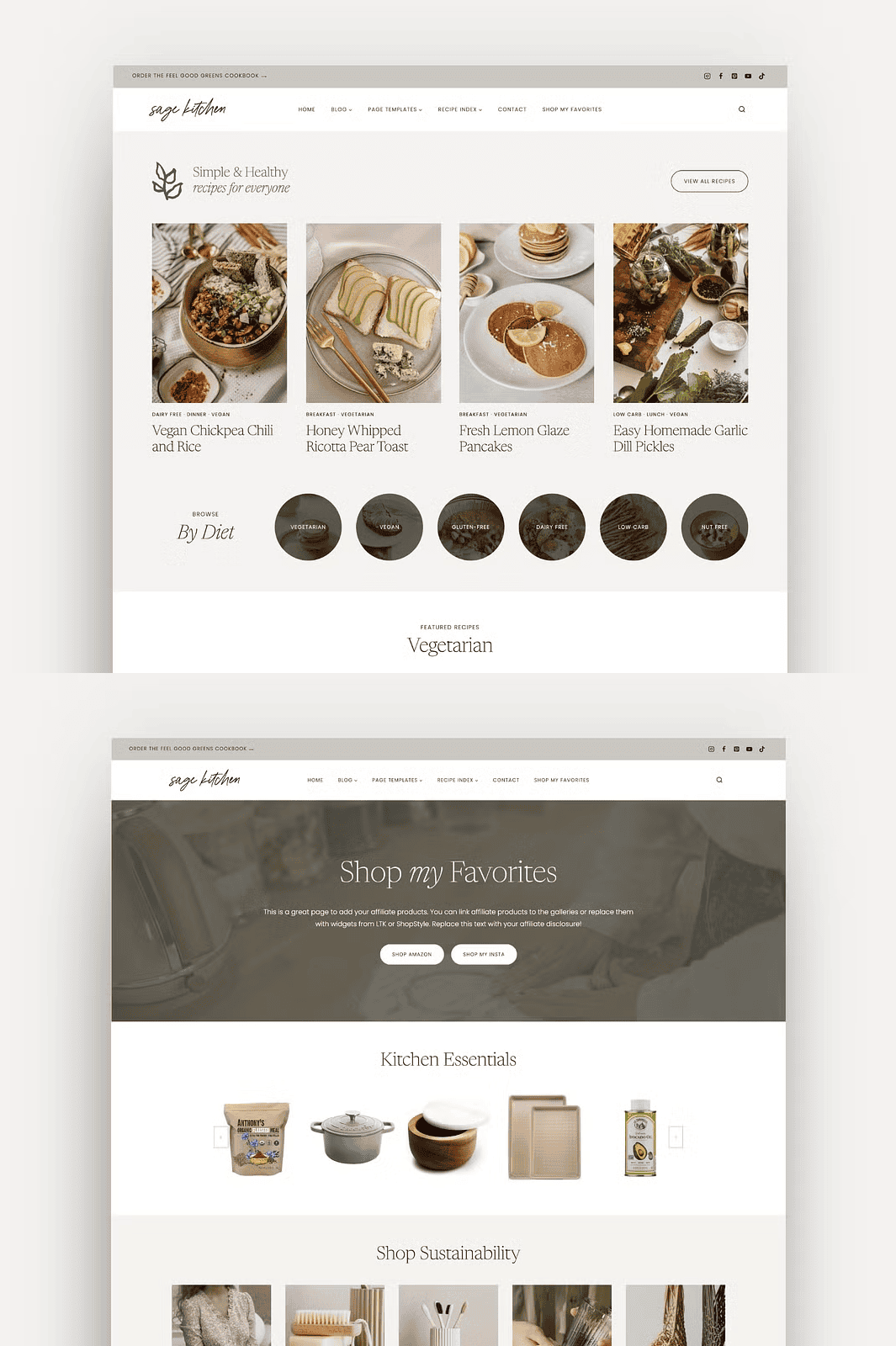 - 9 Ready-to-Use Page Templates – Launch your site faster with templates including: Homepage, About, Shop My Favorites, Recipe Index, Cookbook, Instagram Links, Lead Magnet/Opt-in, Contact, and FacetWP Recipe Index.
